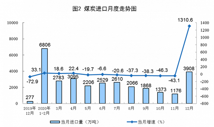 煤炭进口增加。12月份,进口煤炭3908万吨,环比增加2732万吨。2020年,进口煤炭3.04亿吨,比上年增长1.5%。