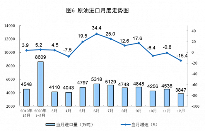 原油进口降幅扩大,国际原油价格继续上涨。进口原油3847万吨,环比减少689万吨,同比下降15.4%,降幅比上月扩大14.6个百分点;2020年,进口原油5.4亿吨,比上年增长7.3%。