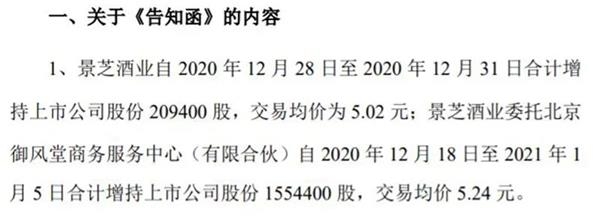 值得一提的是,就在ST亚星1月9日披露与景芝酒业的合作意向协议前,景芝酒业已提前以5.02元的交易均价买入ST亚星20.94万股,又委托北京御风堂买入155.44万股。