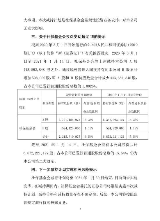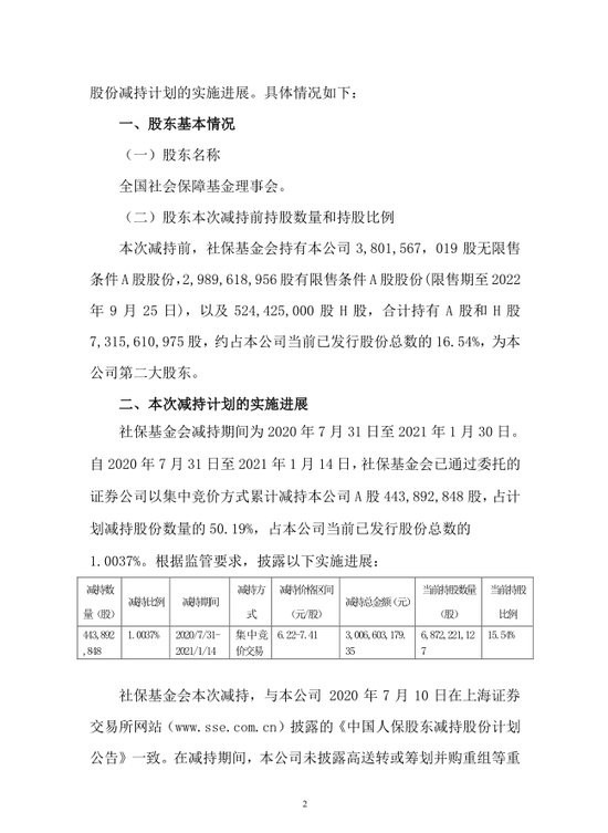 截至2021年1月14日,社保基金会持有本公司股份共计6872221127股,占中国人保已发行普通股股份总数的15.54%,仍为本公司第二大股东。