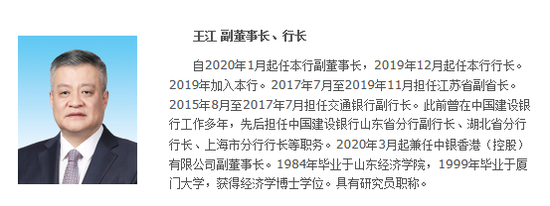 2019年12月,王江出任中国银行行长。2021年1月18日,王江以中国银行行长的身份,参加了中国银行2021年第一次临时股东大会。根据中国银行官网信息,王江代表管理层回答了股东汇金公司关心的问题,并就中国银行做好“六稳”工作、落实“六保”任务等情况进行现场回答。