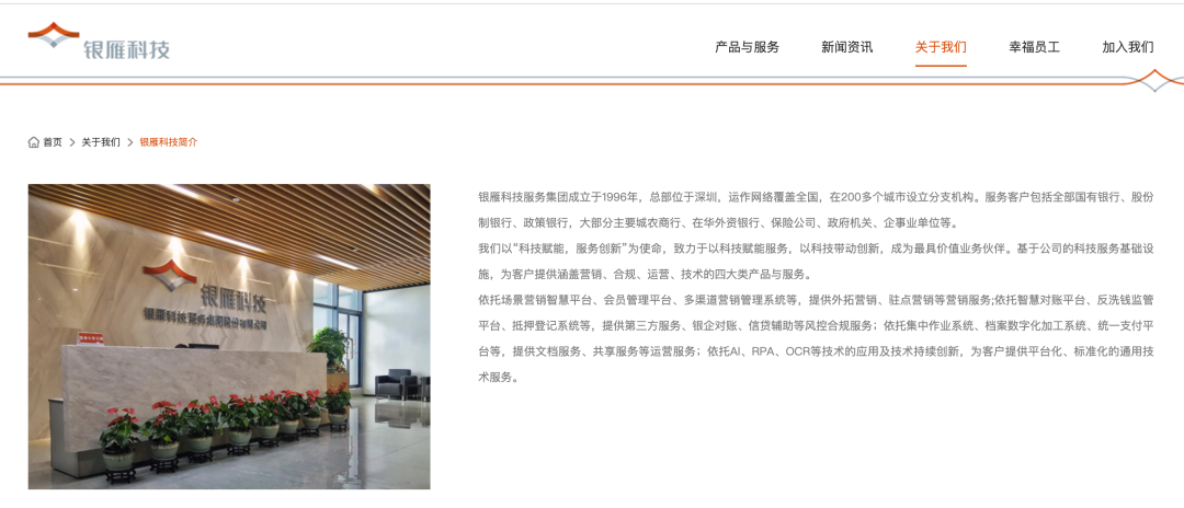 官网显示,银雁科技服务集团成立于1996年,总部位于深圳,运作网络覆盖全国,在200多个城市设立分支机构。
