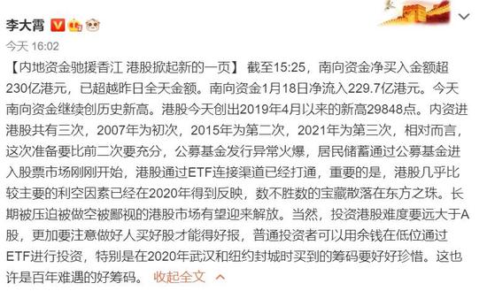 英大证券首席经济学家李大霄表示,港股今天创出2019年4月以来的新高29848点。内资进港股共有三次,2007年为初次,2015年为第二次,2021年为第三次,相对而言,这次准备要比前二次要充分,公募基金发行异常火爆,居民储蓄通过公募基金进入股票市场刚刚开始,港股通过ETF连接渠道已经打通,重要的是,港股几乎比较主要的利空因素已经在2020年得到反映,数不胜数的宝藏散落在东方之珠。长期被压迫被做空被鄙视的港股市场有望迎来解放。当然,投资港股难度要远大于A股,更加要注意做好人买好股才能得好报,普通投资者可以用余钱通过ETF进行投资。