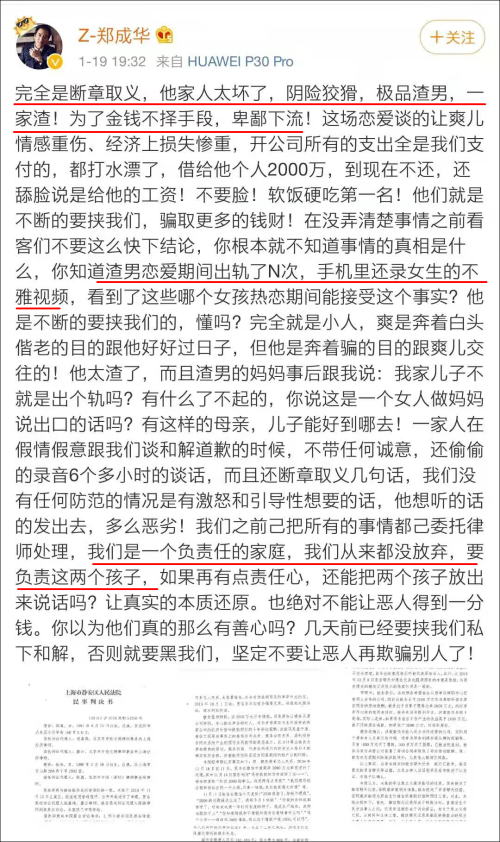 当天晚饭时间,郑爽和其父郑成华先后发文,持续开火,痛陈张恒劣迹:骗钱、出轨、拍不雅视频……