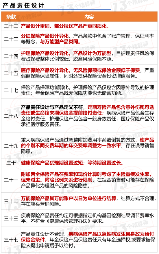 其中,产品条款部分增加8项,责任设计部分增加6项,原费率厘定和精算假设合并,共增加5项,产品报送增加2项。