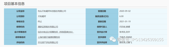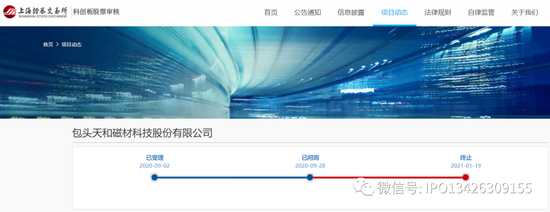 2021年01月19日,包头天和磁材科技股份有限公司因发行人撤回发行上市申请或者保荐人撤销保荐。根据《审核规则》第六十七条(二),本所终止其发行上市审核。