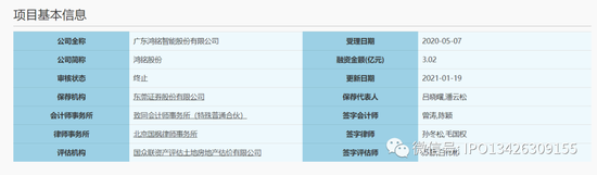 2021年01月19日,广东鸿铭智能股份有限公司因发行人撤回发行上市申请或者保荐人撤销保荐。根据《审核规则》第六十七条(二),本所终止其发行上市审核。2020年5月7日已受理、2020年6月2日已问询、2021年1月14日公告1月21日上会、2021年1月19日终止审核