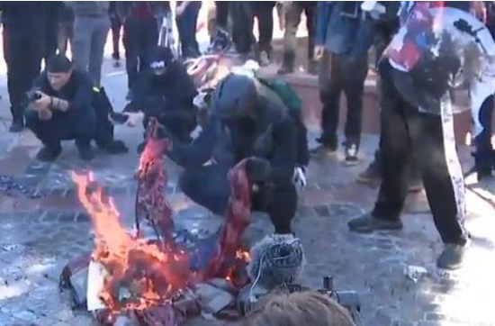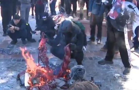 当地时间20日,也就是美国当选总统拜登就职当天,一群抗议者聚集在科罗拉多州的议会大厦外,他们身穿黑衣,并当着警察的面焚烧美国国旗。