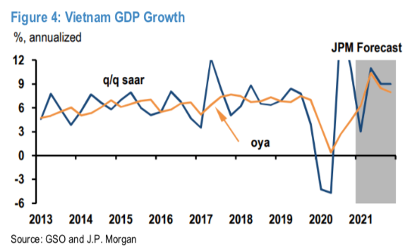 经济数据来看,越南官方披露的数据显示,去年四季度该国GDP增速加快至4.5%,2020全年增速达到2.9%,经济基本面正走在持续复苏的轨道上。随着越南继续保持低利率目标,摩根大通预计2021年越南实际GDP增长将高达8.3%。