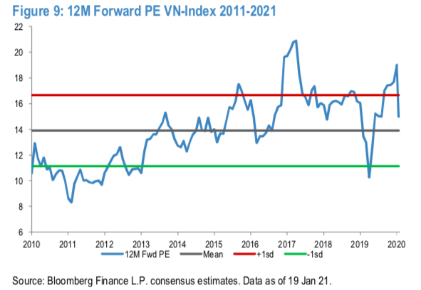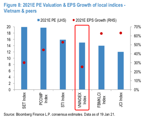 摩根大通预计,2021年越南股市将录得15倍市盈率,介于马来西亚和新加坡股指之间。