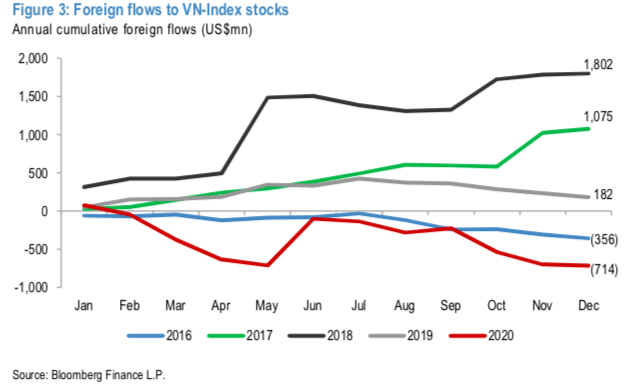 该行认为,有强大的驱动力使得2021年这一趋势得到扭转,如风险溢价较低、美元疲软、潜在增长高于实际增长、以及外资目前在越南较低的持仓水平。