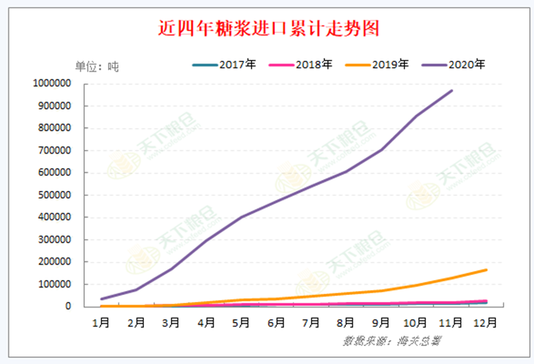 本次2021年关税税则调整并未涉及中国—东盟协定关税税率,因此2021年从东盟地区进口税则号列1702.90项下的子目产品(糖浆、蔗糖水溶液等)适用税率维持0不变。使得糖浆进口量依旧维持高位,截止2020年11月国内糖浆进口量为116270.659吨,较上月148740.657吨减少32470.00吨(降幅为21.83%),较去年同期32823.9吨增加83446.76吨(增幅为254.23%)。2020年1-11月国内糖浆进口量为971083.589吨,较2019年1-11月128243.333吨增加842840.256吨(增幅为657.22%)。