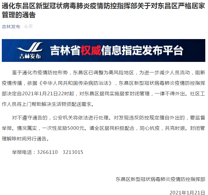 据“东昌发布”微信号,鉴于通化市疫情防控形势,东昌区已调整为高风险地区,为进一步减少人员流动,阻断疫情传播,依据《中华人民共和国传染病防治法》,东昌区新型冠状病毒肺炎疫情防控指挥部决定自2021年1月21日22时起,对东昌区居民实施居家封闭管理,一律不得外出。社区工作人员将上门帮助解决生活物资配送需求。对不遵守通告的,公安机关将依法进行处理。对发现违反防控规定擅自外出的,要监督举报。情况属实,一次性奖励5000元。请全区居民积极配合,同心抗疫,共克时艰。封闭管理解除时间另行通告。