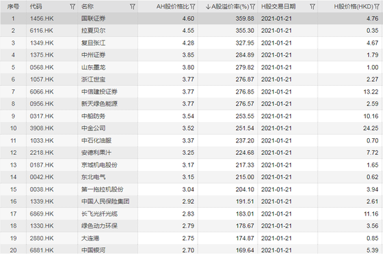 截至昨日,在近一个月的AH股港股通标的中,以港股国联证券为首的130只个股中,129只个股溢价率均超过1%,有51只个股溢价率超过100%。其中不乏中信建投、中金公司之类市值超3000亿的巨头。