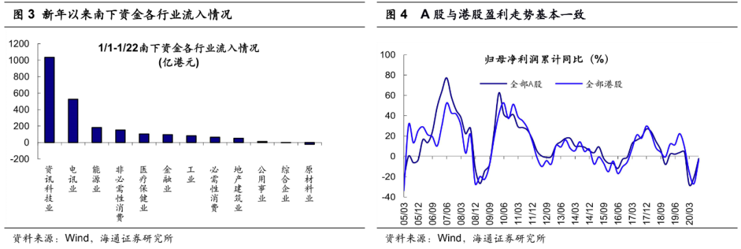 港股的科技股和低估价值均有机会。我们前期港股策略月报《借鉴09-10年,低估价值望补涨-20210104》指出随着经济复苏和企业盈利改善,预计2021年低估价值股有望补涨。目前海外疫情依然严重,经济复苏前景存在不确定性,美联储12月FOMC会议维持当前零利率不变,点阵图显示2023年前不会加息,同时继续维持每月购买800亿美元国债、400亿美元MBS的购债计划,且未设定退出QE的明确时间表,因此港股流动性有望延续宽松格局。由于国内疫情控制较好,自20Q2开始中国经济领先全球开启复苏,企业盈利也逐步改善。港股公司业绩与A股走势基本一致,结合库存周期,我们预计A股企业盈利回升期持续1年半左右,即业绩拐头向下将在21年三、四季度出现,从而我们认为目前港股业绩仍处于回升趋势中。随着港股基本面持续向好,中短期港股金融、工业、能源等顺周期板块可能存在轮涨机会。当前港股金融板块PE(TTM)/PB(LF)为8.1/0.69倍,处于05年以来34.6%/4.5%分位;股息率为3.52%,处于05年以来均值附近。从投资主线看,目前我国经济正处于转型升级中,中期科技+消费是转型方向,当前科技股业绩步入向上周期,本轮行情中科技行业仍是主线,因此港股科技相关行业也值得关注。正如前述分析,新年以来南下资金增持港股也集中在科技行业,整体上看港股科技股估值相对A股更有优势。