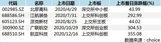 在科创板、创业板上市的航空装备股上市首日涨幅均在300%左右。在中小板上市的北摩高科有11个一字板,在主板上市的派克新材有7个一字板。