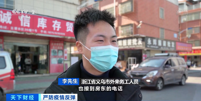浙江省义乌市外来务工人员李先生:今天早上接到房东的电话,问我过年回不回去,不回去的话房租有减免。我听到的时候感觉很意外,觉得我们义乌挺暖心的。