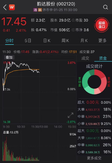 目光转至今日A股市场,截止午盘,韵达股份涨幅为2.41%,最新股价为17.45元,盘中最高涨至17.70元,最新市值为506亿元。