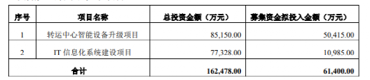 此次非公开发行股票募集资金总额为不超过人民币 6.14亿元。公告显示,本次非公开发行的募集资金在扣除相关发行费用后,5.0415亿元将用于转运中心智能设备升级项目,1.985亿元将用于IT信息化系统建设项目。