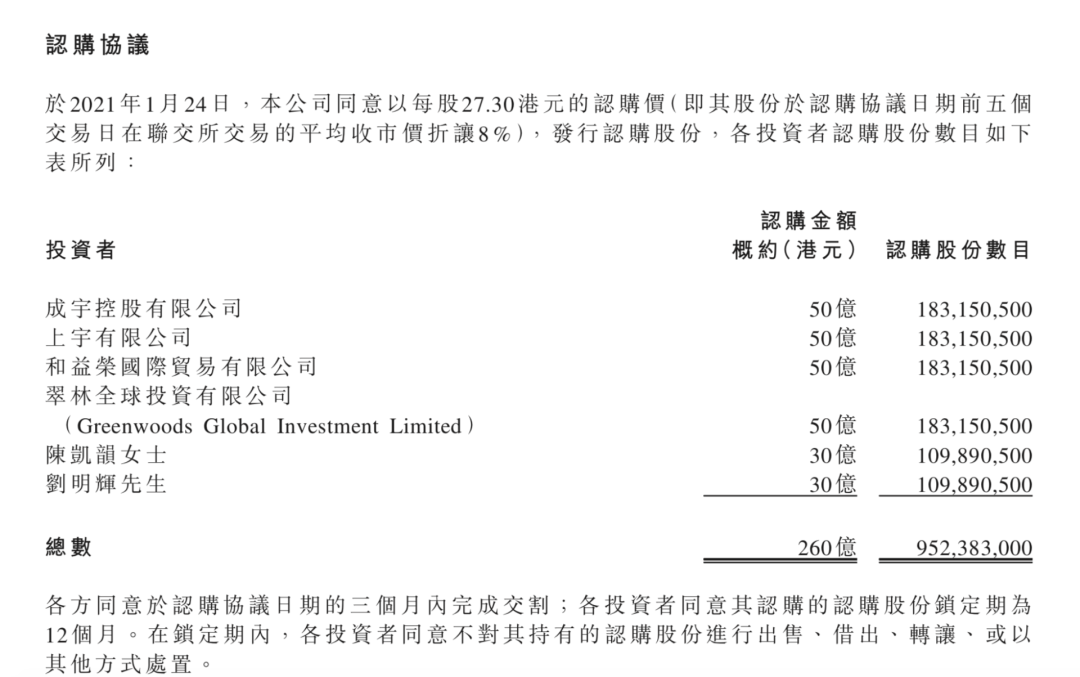 根据公告,有6名战略投资者参与本次定增,分别是成宇控股有限公司、上宇有限公司和益荣国际贸易有限公司、翠林全球投资有限公司,以及陈凯韵和刘明辉两名自然人。前四家机构各自认购50亿港元,陈凯韵和刘明辉分别认购30亿港元,合计260亿港元。