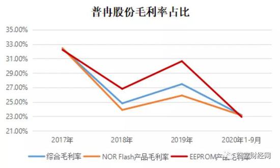 2017年末、2018年末、2019年末和2020年9月末,普冉股份综合毛利率分别为32.39%、24.79%、27.46%和23.17%,其中NOR Flash产品的毛利率分别为32.43%、23.88%、25.88%及23.13%,EEPROM产品的毛利率分别为32.20%、26.80%、30.63%及22.91%,毛利率水平整体呈下降趋势。