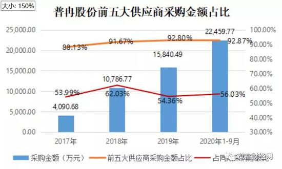 2017年、2018年、2019年和2020年1-9月,普冉股份前五大供应商合并口径的采购金额占比分别为88.13%、91.67%、92.80%和92.87%。具体来看,晶圆主要向华力采购,报告期内采购金额分别为4,090.68万元、10,786.77万元、15,840.49万元及22,459.77万元,占同期采购总额比例分别为53.99%、62.03%、54.36%及56.03%。