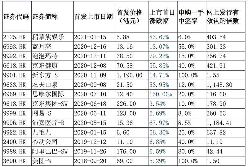值得一提的是,港股打新的核心规则是“一手中签”,简单来说,就是特别照顾小股东,哪怕你只申购一手,也给你一个超级高的中签率。在近期上市的公司中,新东方、蓝月亮的一手中签率较高,分别为100%及55%;再往前,2018年9月美团申购一手也能100%中签。