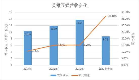 根据英雄互娱近几年发布的年度报告可以看出,近几年来其营业收入不断攀升,从2017-2019年,英雄互娱分别实现营业收入10.36亿元、11.92亿元、13.74亿元,同比增速分别为0.66%、15.12%、15.29%。