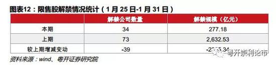 本周(1月25日-1月31日)解禁的有34家公司,较前值减少19家,解禁规模为277.18亿,较前值大幅减少2355.34亿,解禁公司及规模均大幅下降。