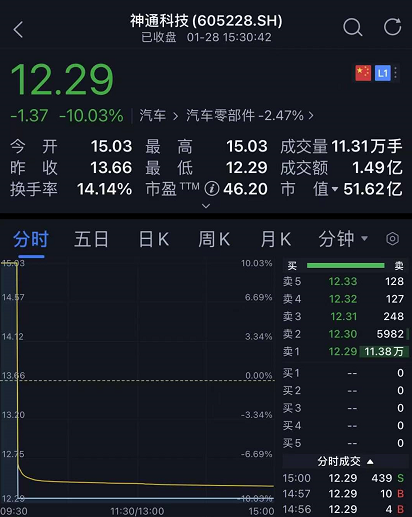 次新股神通科技30秒上演天地板走势,数据显示,9时45分,神通科技涨停价位突然涌现多笔千手规模抛单,几乎瞬间将涨停板砸开。此后抛单更是直指跌停价位,造成公司股价急转直下,并快速封死跌停。其间仅仅经过了30秒。