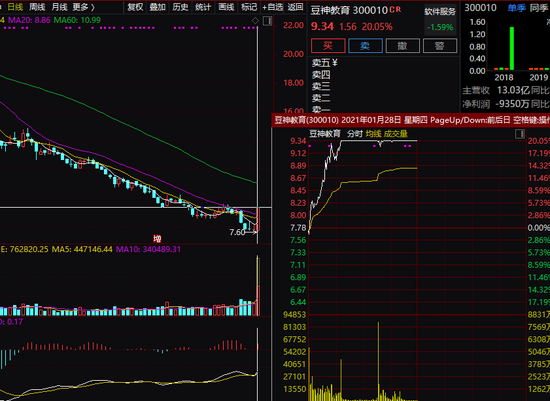 昨天大幅预亏的豆神教育,今天早盘在小幅低开后迅速强力拉升,并在数波拉升后强势冲击涨停,较前一日上涨20.05%。