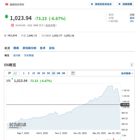 1月19日才上演过史诗级崩盘的越南基准股指胡志明指数(VN INDEX)跌幅扩大至6.67%。1月19日该股指闪崩震惊市场,当天该股指盘中跌超6%,将近抹去年内全部涨幅,近四分之一越南股票齐齐跌停,卖出指令飙升导致交易所崩溃近半小时。