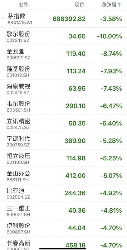 多只“茅”明星股全线下跌,茅台指数跌去了3.58%。