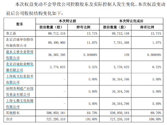 在引入战略投资者方面,启迪华创拟将其持有的7272.95万股无限售流通股份协议转让给上海阅文、深圳利通;文睿公司拟将其持有的3636.48万股无限售流通股份协议转让给百度七猫。上述协议转让后,上海阅文、深圳利通、百度七猫分别将持有公司5%的股份。