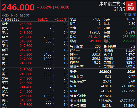 1月29日,康希诺高开高走,截至发稿,涨近2%,报365.85元,总市值694亿元。港股方面,康希诺生物-B涨逾3%,报246港元。