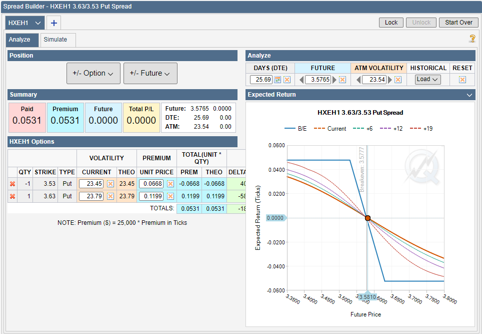 COMEX铜期权操作方面,国际衍生品智库分析师认为,短期铜价偏弱震荡,建议投资者尝试做空为主,同时考虑到COMEX铜期权隐含波动率开始低位回升,为了避免隐含波动率对于策略的影响,建议构建波动率中性的熊市价差组合,例如买入高行权价的3月看跌期权,同时卖出低行权价的3月看跌期权。