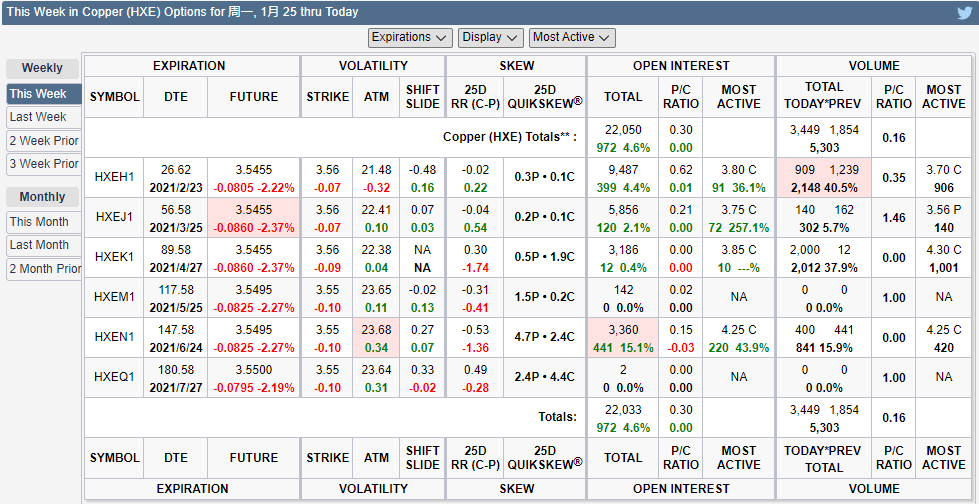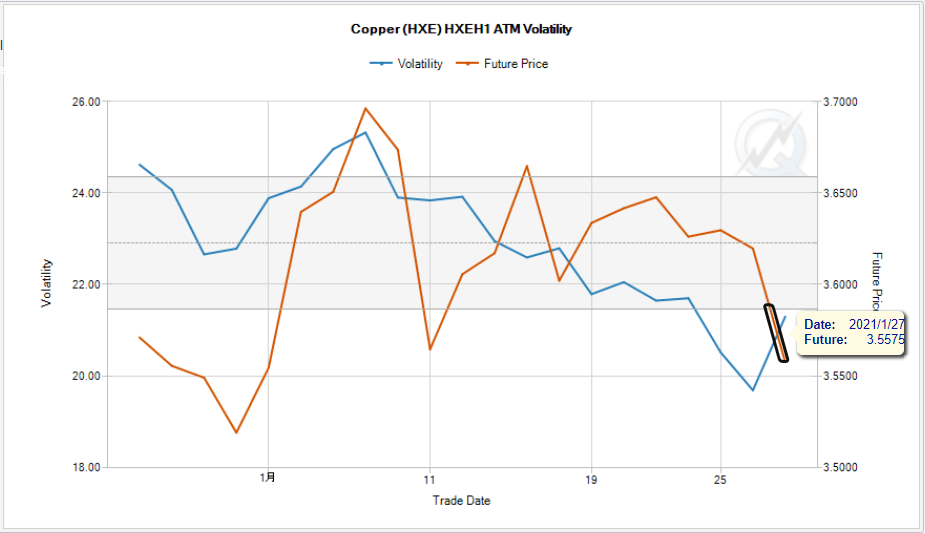 期权隐含波动率是市场对标的在期权的未来存续期内波动率的预期,是通过当前期权价格反推出来的“波动率”,隐含波动率可理解为期权的“估值”,隐含波动率偏高,标的此时更容易发生大幅度变化,此时的期权的“估值”也会偏高。从COMEX铜期货价格与期权隐含波动率走势图来看,进入2021年1月以来,随着铜价冲高回落,铜期权隐含波动率同样呈现高位回落态势,最低降至20%以下。不过从近几天走势来看,铜期权隐含波动率有低位回升趋势,预计近期缓慢回升的可能性大。