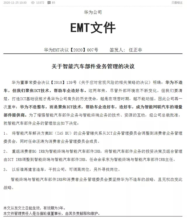 华为内部一直有一句话:华为不造车,但我们聚焦ICT技术,帮助车企造好车。去年11月流出的一份华为内部文件,显示华为依然坚持这一战略,帮助车企做好智能化。同月,长安汽车宣布将携手华为、宁德时代,联合打造一个全新高端智能汽车品牌。