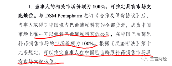 先声药业是中国市场上唯一可以销售巴曲酶原料药的公司,在中国巴曲酶原料药销售市场的市场份额为100%。可推定具有市场支配地位。