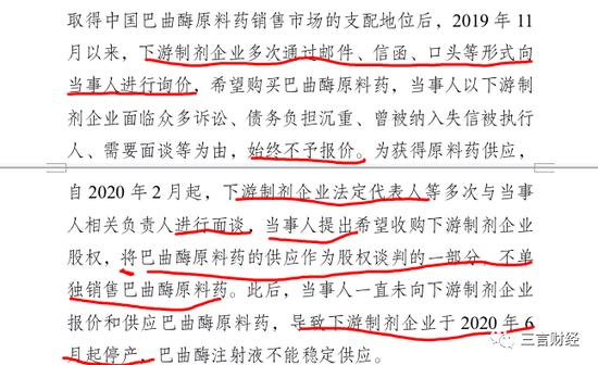 自2020年2月起,下游制剂企业法定代表人等多次与当事人相关负责人进行面谈,先声药业提出希望收购下游制剂企业股权,将巴曲酶原料药的供应作为股权谈判的一部分,不单独销售巴曲酶原料药。