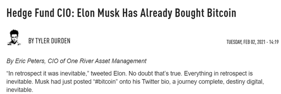 One River Asset Management首席投资官Eric Peters表示,马斯克很可能已经购买了比特币。
