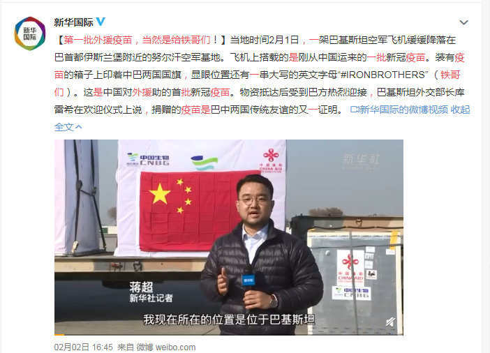 第一批外援疫苗,当然是给铁哥们!新华国际消息,当地时间2月1日,一架巴基斯坦空军飞机缓缓降落在巴首都伊斯兰堡附近的努尔汗空军基地。飞机上搭载的是刚从中国运来的一批新冠疫苗。装有疫苗的箱子上印着中巴两国国旗,显眼位置还有一串大写的英文字母“#IRONBROTHERS” (铁哥们)。