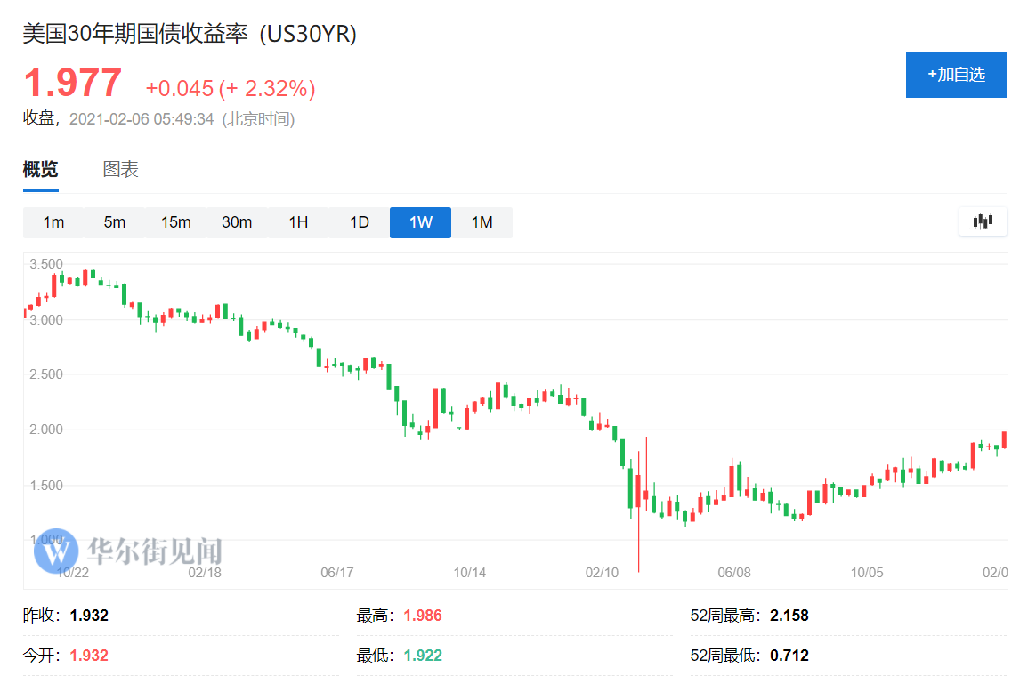2月5日周五,美国10年期基准国债收益率一度升至1.188%,创去年3月以来新高;30年期美债收益率盘中一度涨至1.9850%,续创2020年2月21日以来新高。
