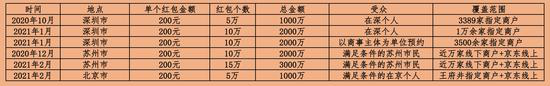 2020年10月9日起,数字人民币开始在深圳开展大规模公众测试,通过抽签的方式发放1000万元“礼享罗湖数字人民币红包”;此后,深圳又接连开展了两轮测试;此外,继2020年12月苏州成功发放2000万元数字人民币消费红包后,苏州又于2021年2月5日开启“数字人民币·苏州年货节京东专场”活动,再次发放3000万元数字人民币苏州年货节红包。