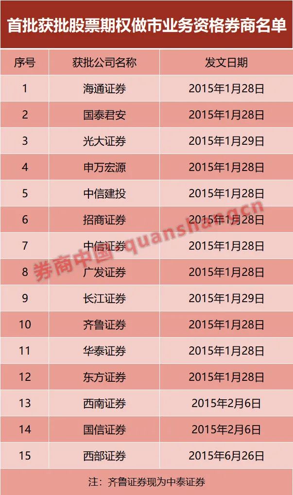 在制度建设完成后,首批参与股票期权做市业务的券商也陆续亮相,共有15家券商获得业务资格。