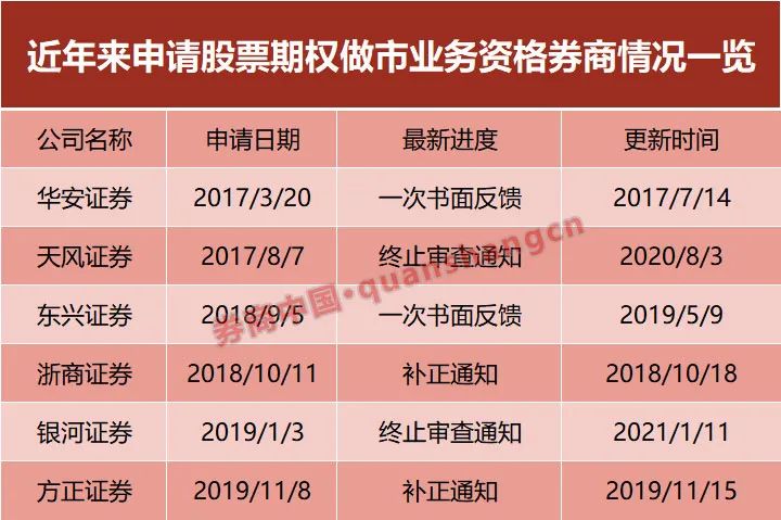 具体来看,在2017-2019年期间,华安证券、天风证券、东兴证券、浙商证券、银河证券和方正证券6家公司曾先后递交股票期权做市业务资格的申请,其中浙商证券、方正证券仍处于材料补正阶段,银河证券和天风证券的申请已终止审查,东兴证券和华安证券则还在“苦苦等待”。