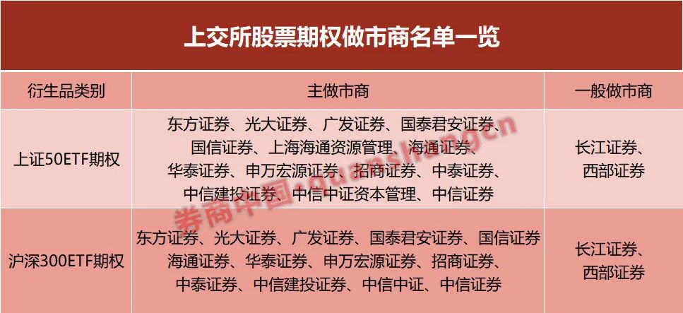 截至2020年底,上证50ETF期权共有16家做市商,其中主做市商14家,一般做市商2家。沪深300ETF期权共有15家做市商,其中主做市商13家;一般做市商2家。