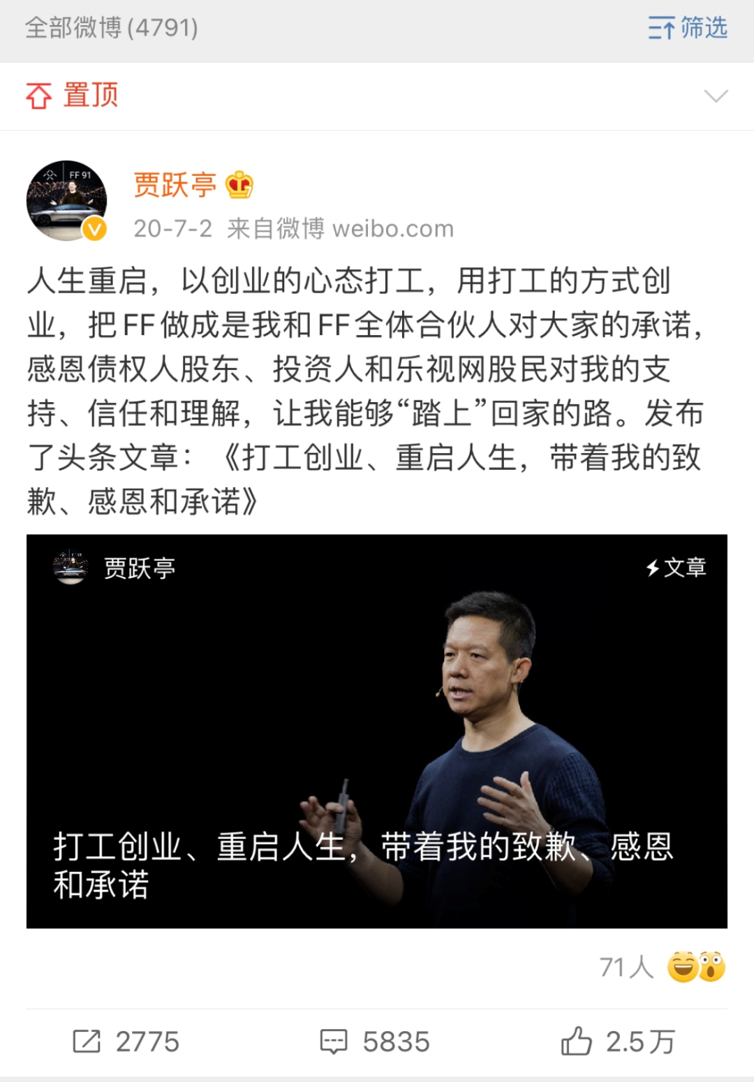 点开贾跃亭的微博,置顶的依然是2020年那篇头条文章《打工创业、重启人生,带着我的致歉、感恩和承诺》。在洋洋洒洒、姿态低位、言语真诚的文字里,外界看不到昔日叱咤风云的贾总,更多是一个敢于承认失败却仍旧怀揣梦想的打工创业者,让人不禁想给他留下一句“加油”。