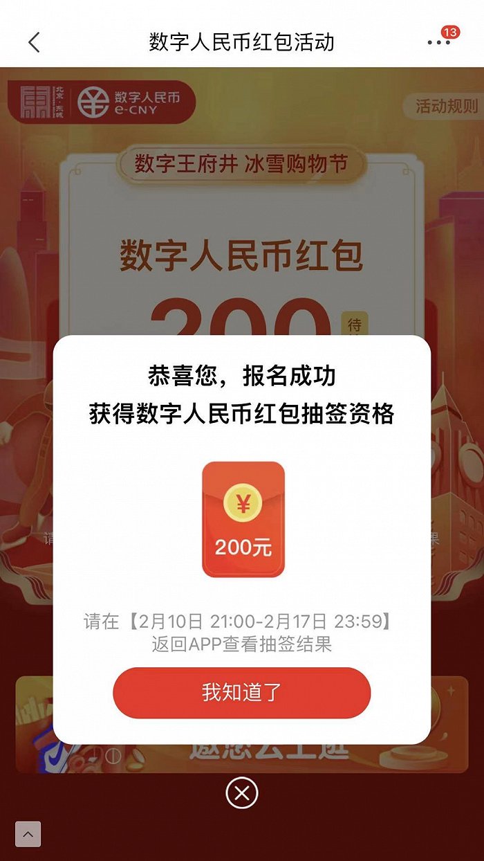 据介绍,“数字王府井 冰雪购物节”活动由北京市东城区人民政府主办,通过预约报名、抽签发放红包的方式,向中签人员发放5万份数字人民币红包,每份红包金额200元。