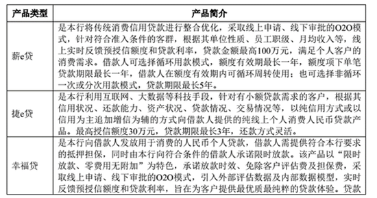 重庆银行的个人消费贷产品主要包括“薪e贷”、“捷e贷”、“幸福贷”、“长江卡循环贷款”、个人汽车消费贷款、个人综合消费贷款及联合运营贷款等,产品体系比较完善。